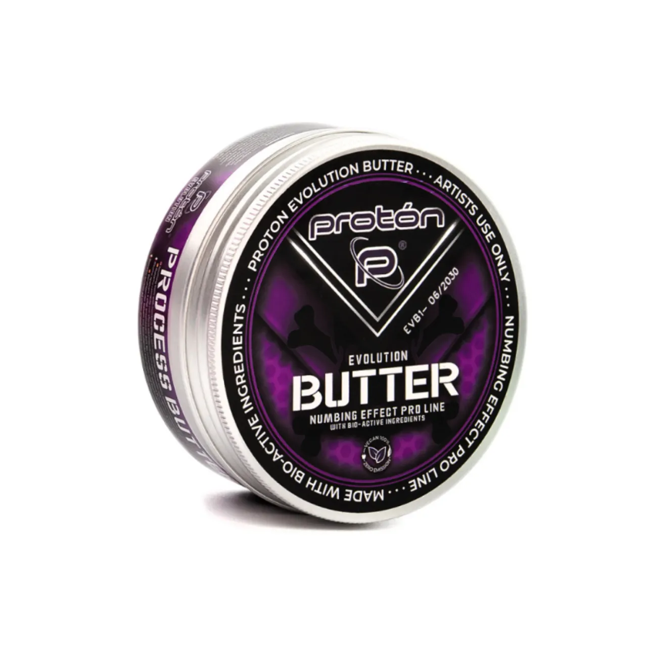 EVOLUTION – חמאת פרוטון פרוסס היא חמאה מקצועית שנועדה לספק נוחות וטיפוח מקסימליים לעור במהלך הקעקוע. תערובת מנוסחת במיוחד של למעלה משבעה מרכיבים טבעיים מלחחת, מרגיעה את העור ומסייעת לשמור על גמישותו, ויוצרת תנאים אופטימליים הן למקעקע והן ללקוח.